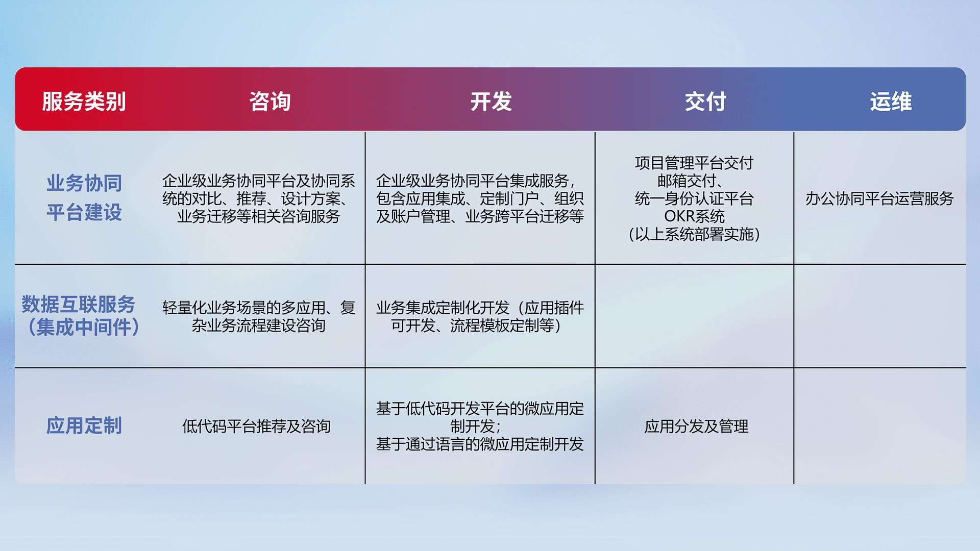 针对钉钉、、、、企微、、、、IDaas等平台级产品提供产品的规划、、、方案、、、交付、、、、定制化开发等服务,,,,实现如统一协同办公、、、智能客户服务、、混合会议管理、、、、智能数据查询、、、等业务场景,,实现数字化转型。。